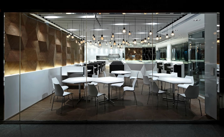 卡座、圆桌、长桌...座位排布灵活多变,取餐动线科学巧妙,满足各种规模聚会的需求。隔而不断的石膏板材质隔断,以舒适为向导,墙面动感的鱼群装饰,为客人提供错落,更具层次感的就餐环境。